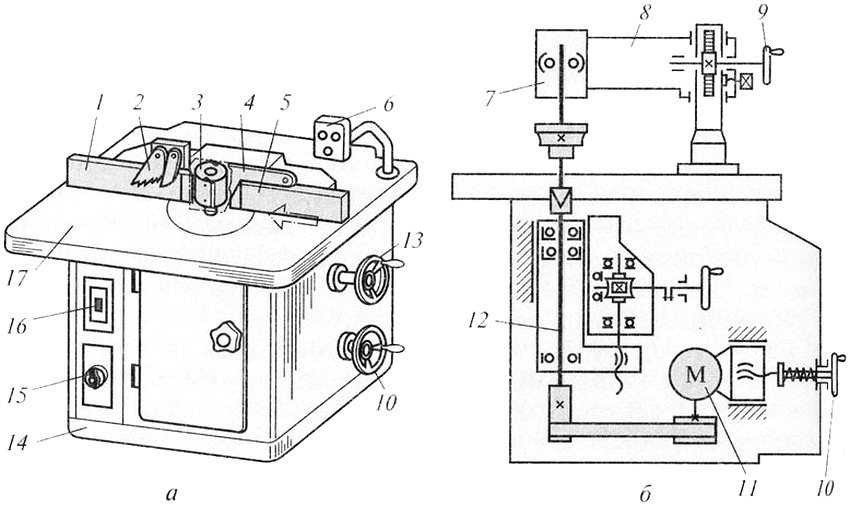 Схема устройства фрезерного станка (а — общий вид, б — кинематическая схема): 1 , 5 — направляющие линейки; 2 — зубчатый сектор; 3 — фреза; 4 — ограждение; 6 — пульт управления; 7 — дополнительная опора шпинделя; 8 — кронштейн; 9 — маховичок подъема кронштейна; 10 — маховичок натяжения ремня; 11 — электродвигатель; 12 — шпиндель; 13 — маховичок настройки шпинделя по высоте; 14 — станина; 15 — переключатель частоты вращения шпинделя; 16 — выключатель; 17 — стол