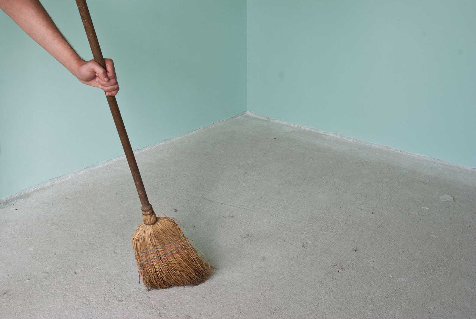 Шаг 1. Первый этап – это подготовка основания. Черновой пол тщательно очищается от мусора и пыли. Производится обезжиривание поверхности, если на ней имеются пятна масла или краски. Все трещины, сколы заделываются герметиком, неровности шлифуются. Поверхность тщательно высушивается (допустимые показатели влажности основания – не более 4%, воздуха – не более 50%).