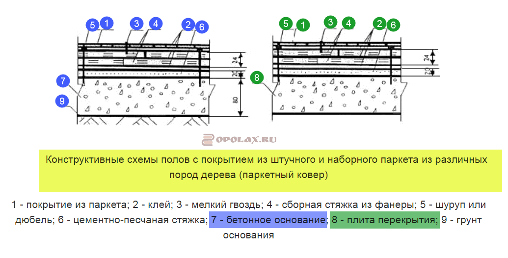 Пришло время посмотреть ЧЧ схем конструкций устройства штучных и наборных паркетных полов по ровным бетонным и другим перечисленным выше основаниям (стяжкам, наливным полам).
