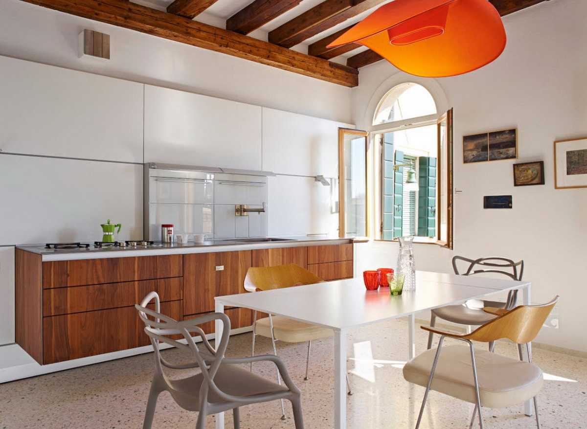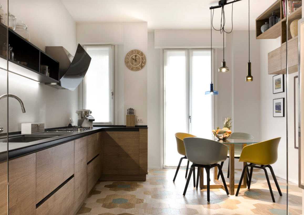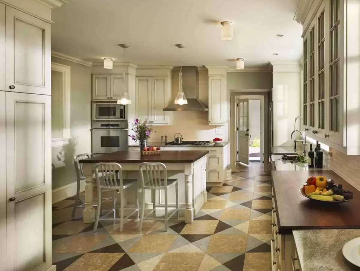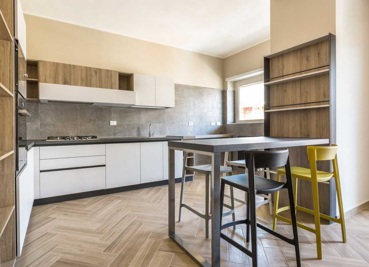 При желании можно сделать и комбинированный пол, особенно актуально это для кухонь, соединённых с гостиной. За счёт перехода текстур удаётся удачно зонировать помещение.