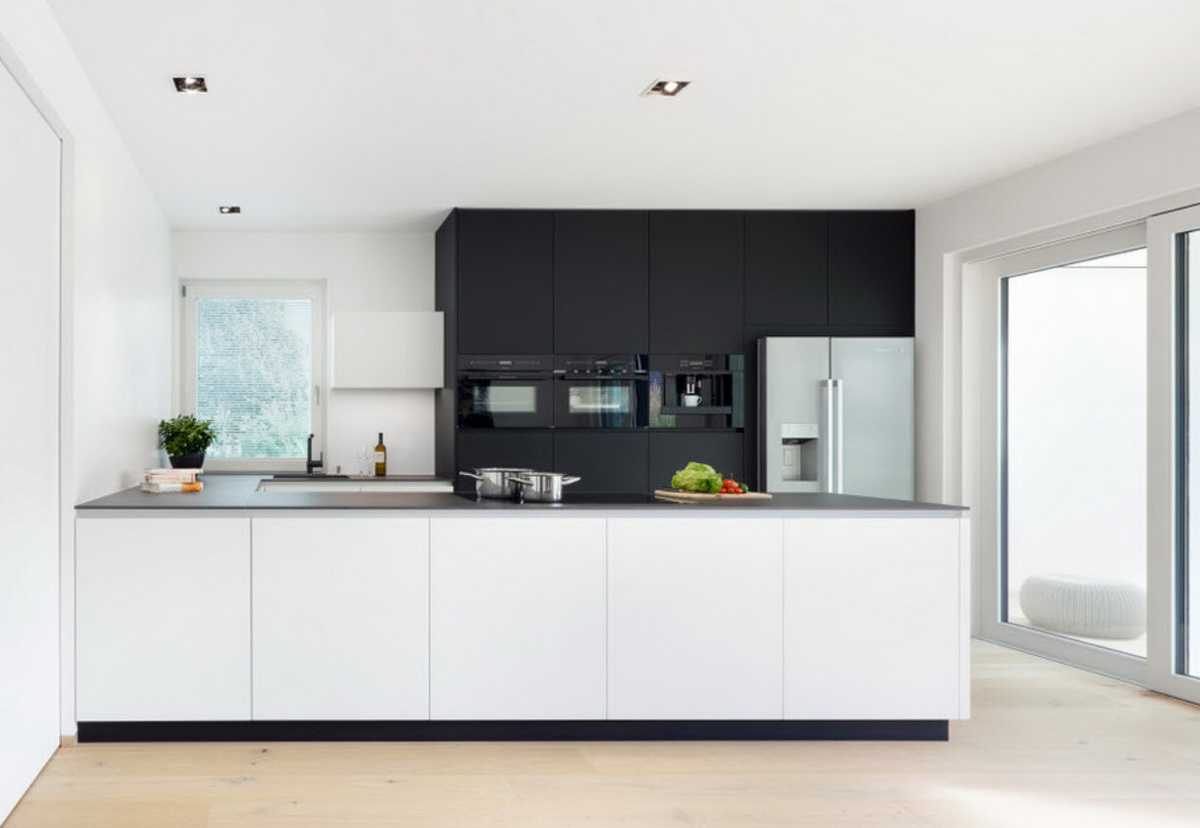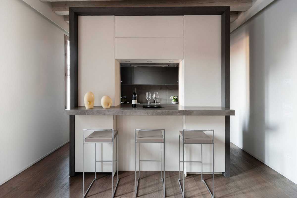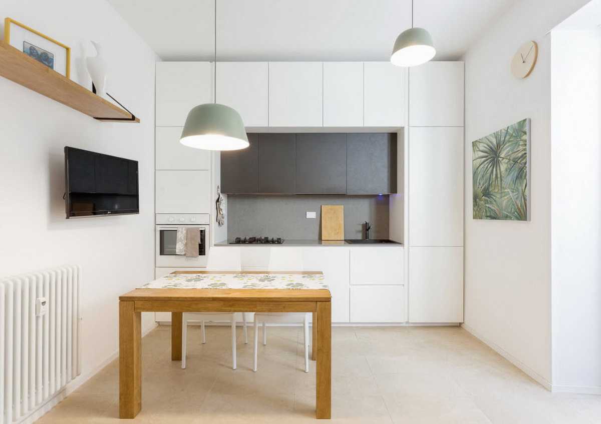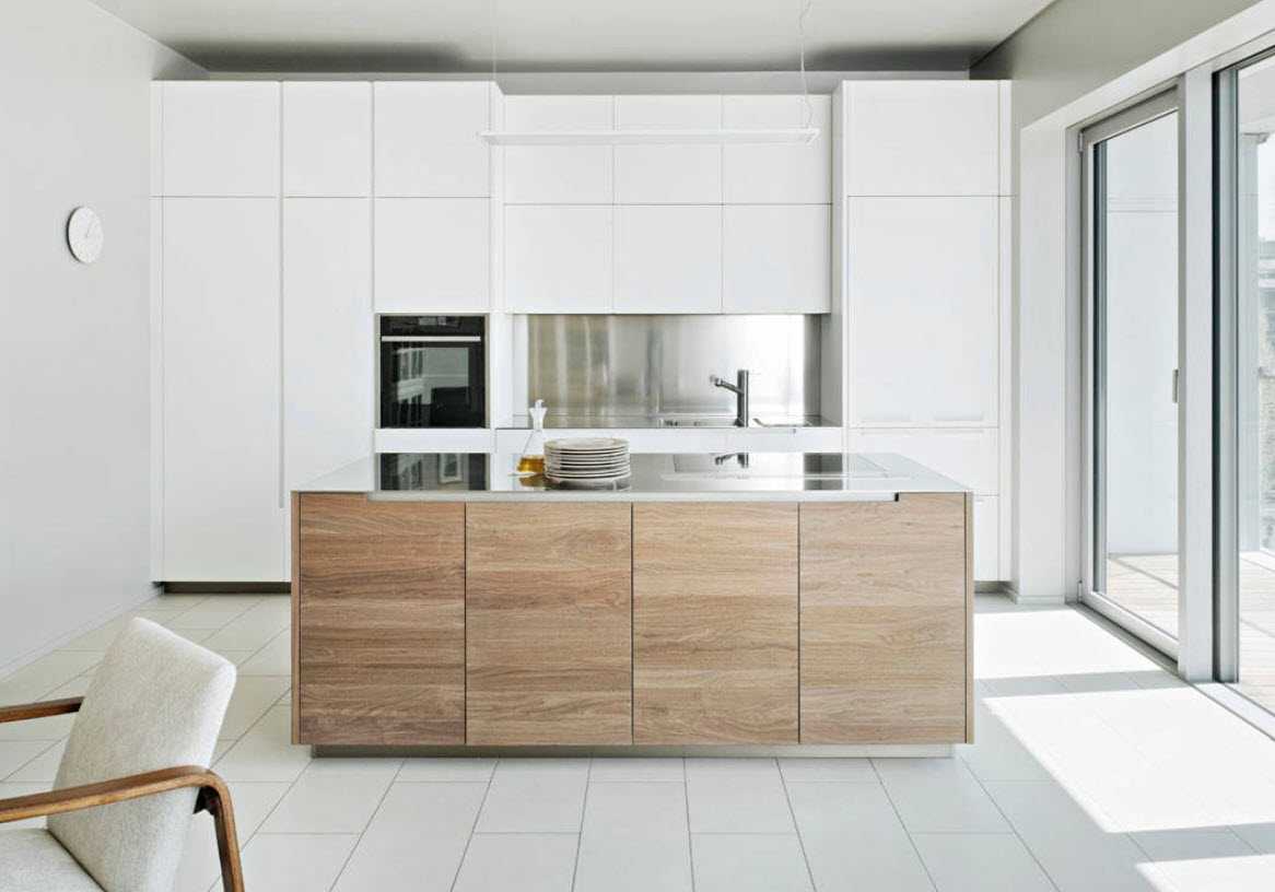 При желании можно сделать и комбинированный пол, особенно актуально это для кухонь, соединённых с гостиной. За счёт перехода текстур удаётся удачно зонировать помещение.
