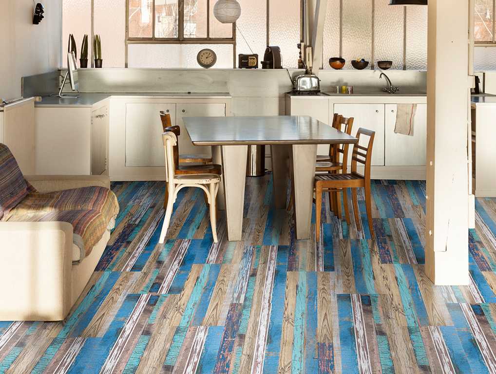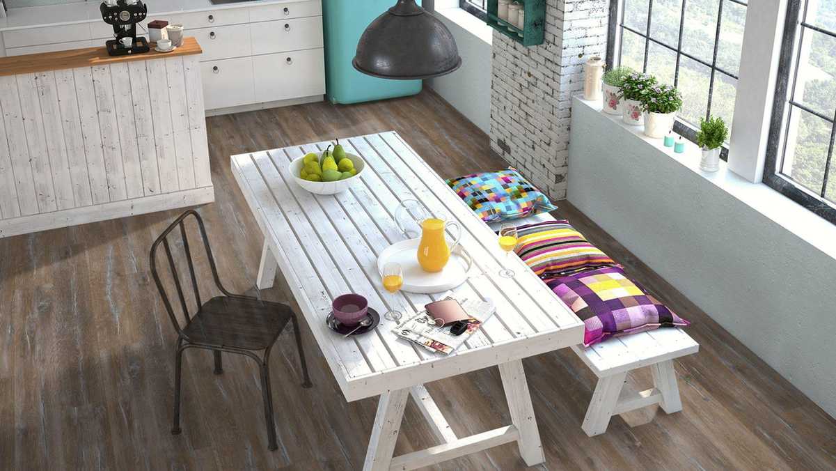 В качестве альтернативы можно воспользоваться ламинатом. Такое покрытие несколько менее экологично, но на нем не образуются царапины и его легко мыть. Данное покрытие имитирует различные породы деревьев. Некоторые сделаны под камень или плитку