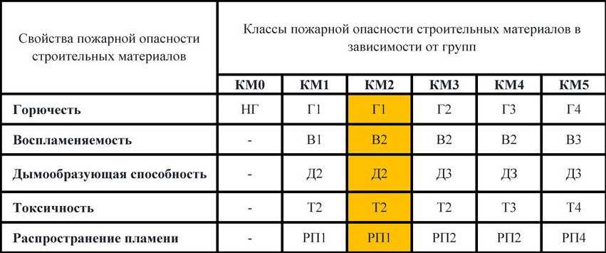 - КМ1 – с показателями: горючести – Г1 (слабогорючие), воспламеняемости – В1 (трудновоспламеняемые), способностью к образованию дыма – Д2 (умеренная), токсичности продуктов процесса горения – Т2 (умеренно опасные), распространения пламени – РП1 (не распространяющие).