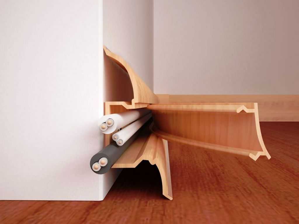 Некоторые плинтуса предусматривают в своем составе наличие специального канала, где будет располагаться кабель. Канал этот очень удобен еще и тем, что он закрывается специальной крышкой, сливающейся с общей конструкцией напольного карниза. Это позволяет с легкостью менять или ремонтировать провода во время эксплуатации кабеля.