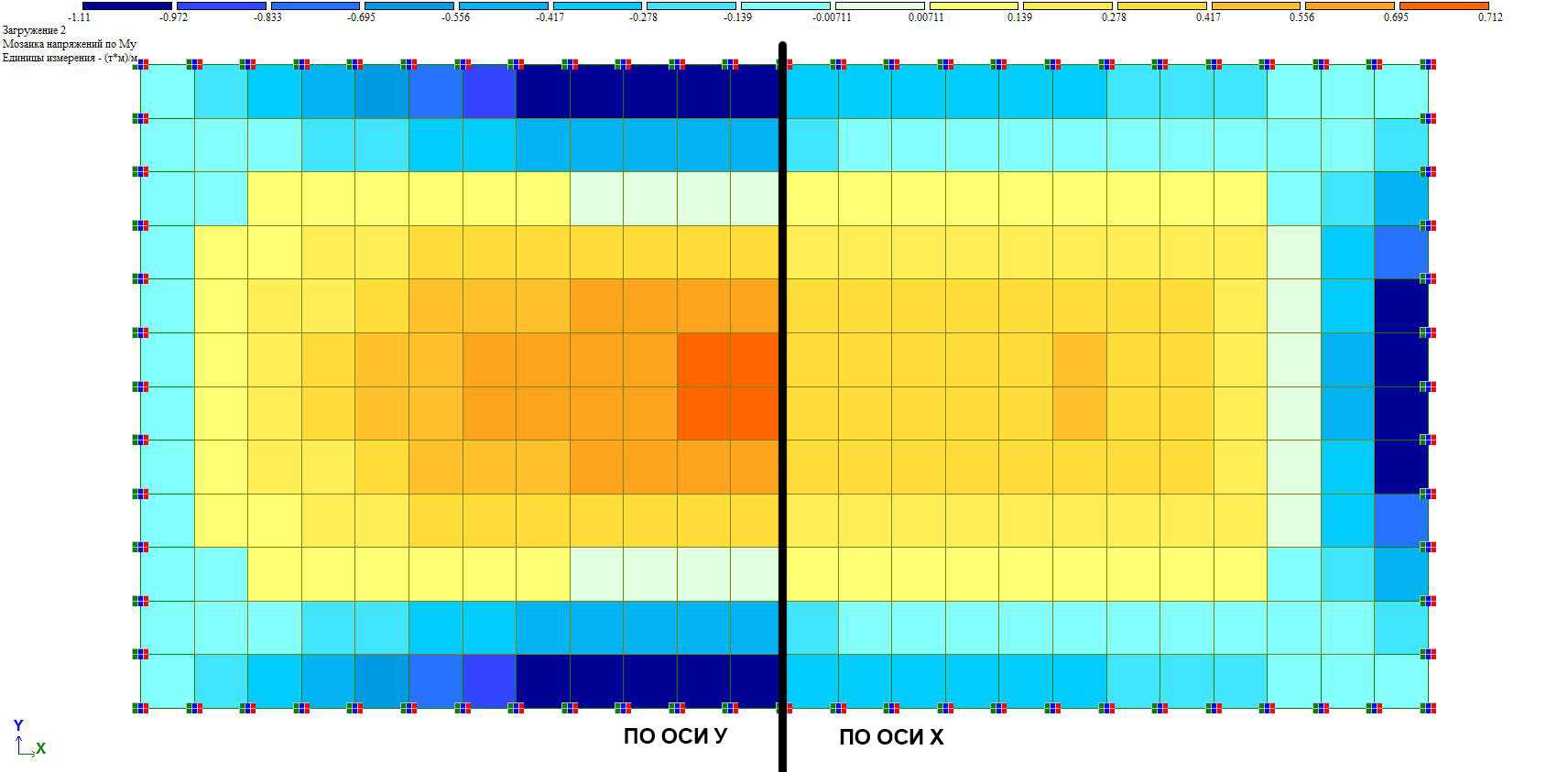 На мозаике напряжений так же заметно, область красного цвета соответствует растяжению плиты в нижней части, а область синего цвета сжатие плиты в нижней части.