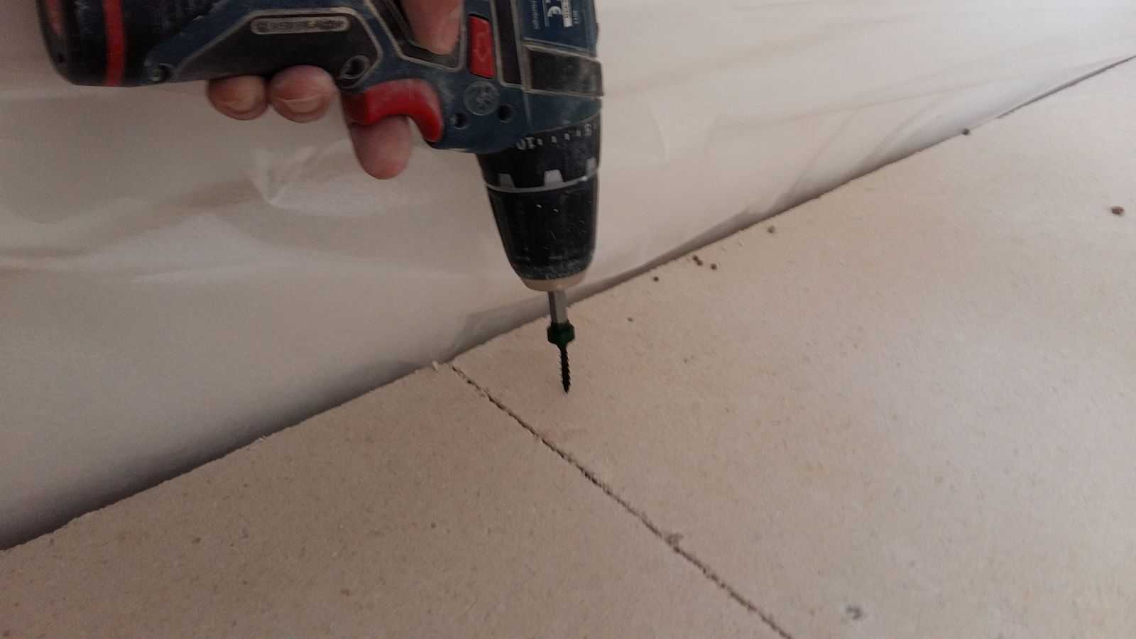 - Поверх изоляционного слоя укладывают подложку. Для которой используют листы гипсокартона или цементно-стружечную плиту толщиной до 2 см. Она служит основанием для укладки керамической плитки на деревянный пол. Листы надежно крепятся к черновым доскам с помощью саморезов по дереву с шагом ориентировочно 15-20 см. Учитывая, что доски будут изменять свои размеры под действием влажного окружающего воздуха, необходимо между подложкой и стенами оставить зазор около 10 мм, который заделывается монтажной пеной.