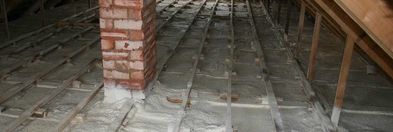 Напыляемый пенополиуретан – экологичный, прочный, долговечный (служит не менее 30-40 лет) утеплитель с хорошими теплотехническими показателями. Энергоэффективность обуславливается равномерным нанесением без стыков и зазоров. Нанесение не требует особых подготовительных работ, пена заполняет все неровности и пустоты, после застывания по ней можно ходить. К недостаткам ППУ относят его относительную дороговизну и необходимость использовать специальное оборудование для монтажа.