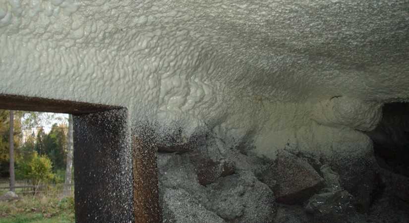 - Нижнюю теплоизоляцию пола можно сделать пенополиуретаном. Он представляет собой жидкий материал, наносимый методом напыления. Но применение этой технологии предусматривает наличие специального оборудования, поэтому утеплить пол самому не получится. Для этой работы придется привлекать профессионалов.