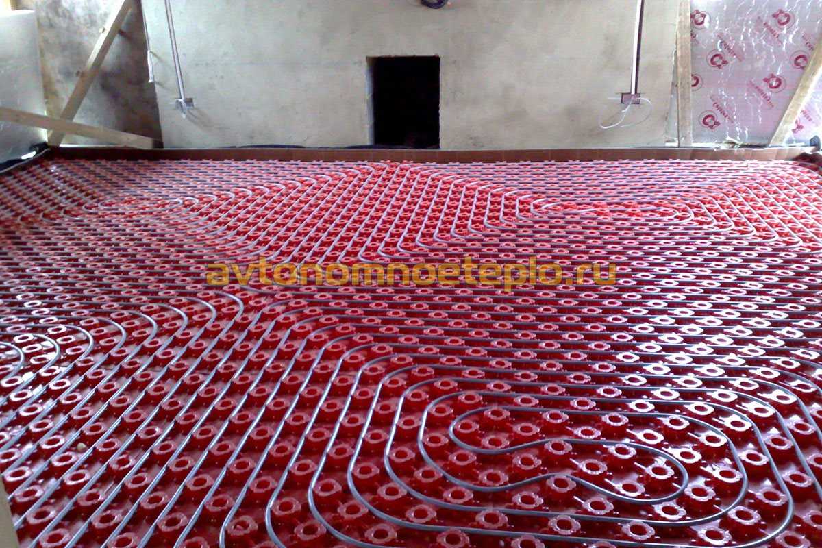 Профильные направляющие монтажные маты для водяного теплого пола, после прокладки трубопровода, сверху заливаются небольшим слоем клеевого раствора. После высыхания в течение 1-2 дней, можно начать эксплуатацию системы отопления.