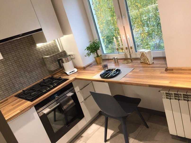Место подоконника может занять рабочая поверхность. Если под окном будут закрытые шкафы, то радиатор отопления следует перенести, предварительно согласовав перепланировку в жилищно-коммунальных службах. В противном случае для свободной циркуляции теплого воздуха необходимо делать в столешнице отверстия.