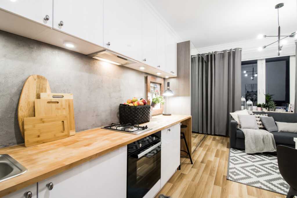 Если есть возможность согласовать перепланировку по присоединению лоджии к площади маленькой кухни, то стоит ей воспользоваться. Так удастся выделить место для обеденной зоны, барной стойки или небольшой зоны отдыха.