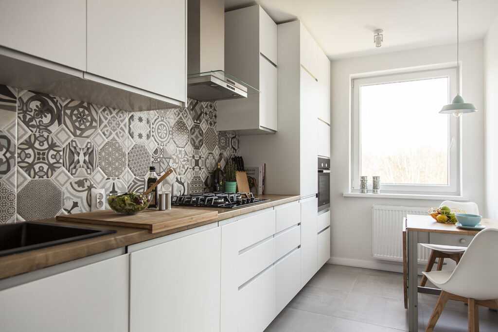 - Плитка. Классический вариант на долгие годы. Единственный минус, это трудозатратный процесс. Для того, чтобы обклеить всю кухню керамикой уйдет не мало времени и средств.