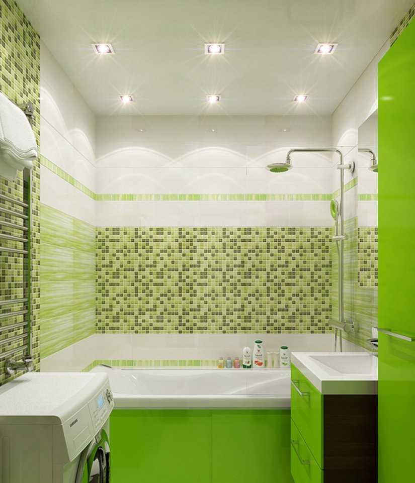 На фото раскладка зеленой плитки кабанчик со смещением на стене в интерьере ванной комнаты.