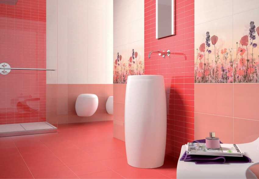 Для отделки стен и пола в ванных используются плиты монокоттура. Изделия отличаются насыщенным оттенком, декоративным рисунком.