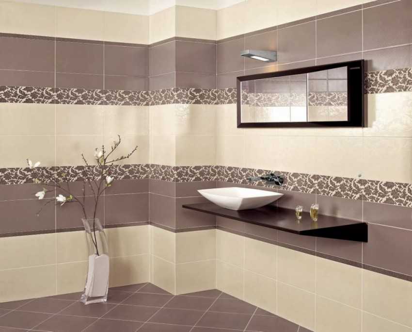 Сделать помещение зрительно просторнее, кроме горизонтальной ориентации плитки, помогут горизонтальные полосы по всему периметру стен, выполненные из тёмной, гармонирующей с основным светлым фоном стен, керамической плитки. Бордюр может отличаться цветом от плитки остальных полос, но тоже должен быть тёмным. Однако в цветах облицовки стен тёмные тона полос не должны преобладать над светлыми, иначе эффект от таких полос будет прямо противоположным – комната визуально потеряет в размерах.