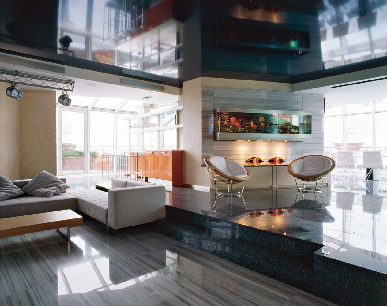 Обычно этот стиль сочетает в себе нестандартные формы предметов интерьера, это же требование касается и расцветок. Для этого стиля характерно применение напольного покрытия черного, белого, красного цвета. Расцветка пола выбирается в зависимости от доминирующего цвета общего стиля помещения.