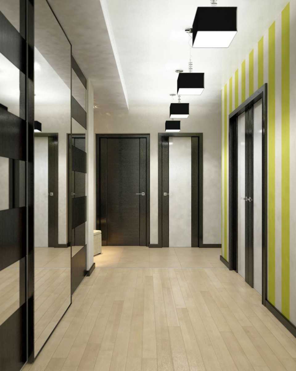 Расположенный таким образом ламинат в коридоре, позволяет решить несколько задач: