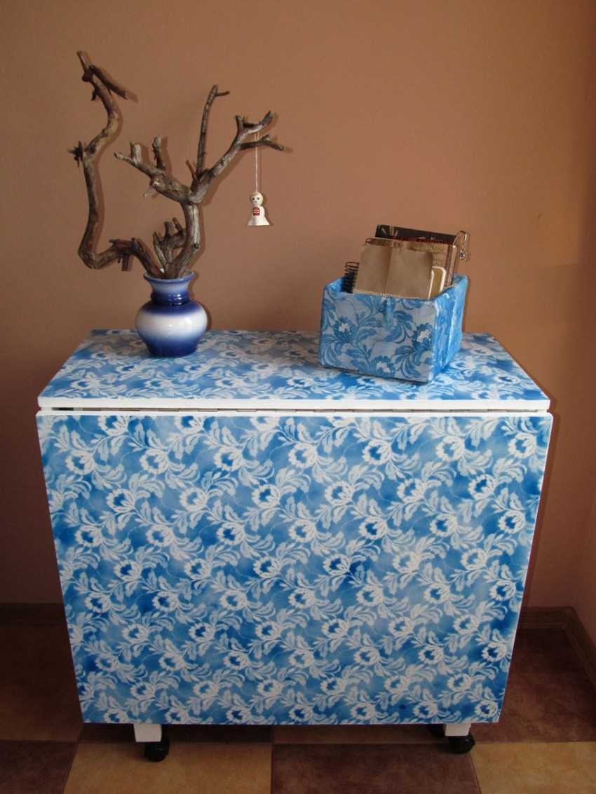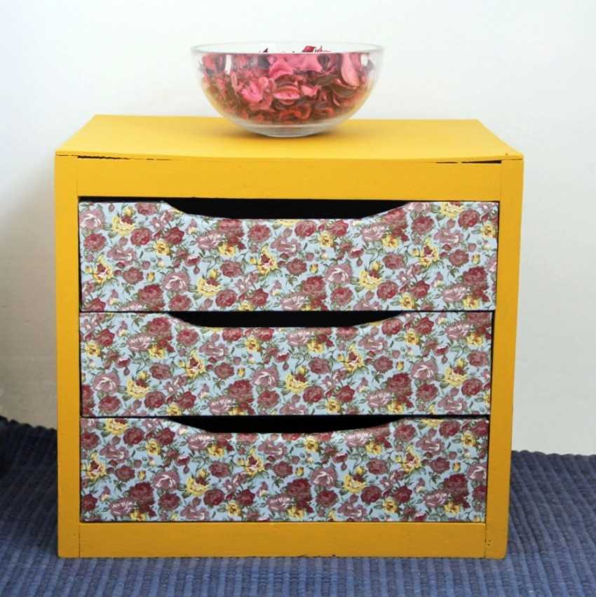 Старый комод, тумбочка, столик или обыкновенная полочка заиграет новыми красками, если оклеить фасадные части кусочками обоев. Хотя внешней стороной можно и не ограничиваться. Оригинально смотрятся ящички, оклеенные обоями изнутри.