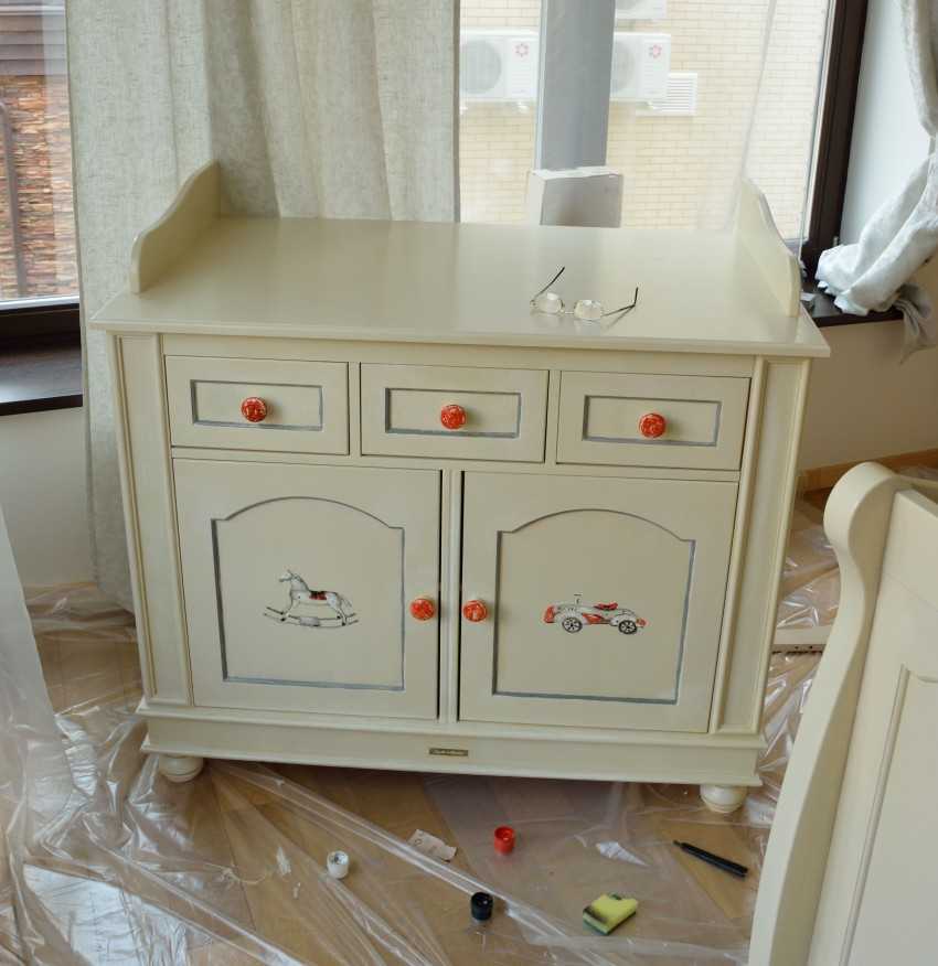 Ход работы будет следующим: подготовьте мебель, снимите с неё краску, используя шпатель. После очистите и обезжирьте поверхность.