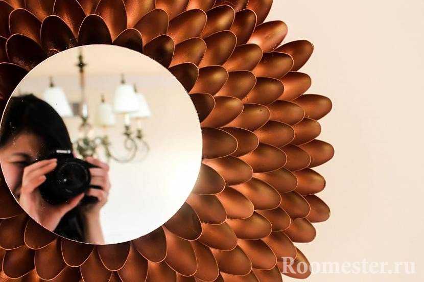 Для поделок лучше использовать круглое зеркало. Отрежьте от пластиковых ложек рукоятки, оставив черпаки. Приклейте их в несколько рядов по всему периметру зеркала. Окрасьте декор из баллончика. Вместо ложек можно взять пуговицы, бусины, ракушки, прищепки.