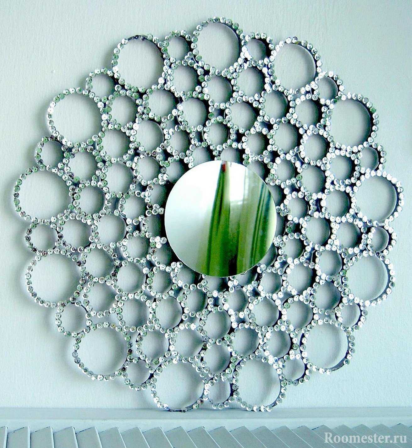 Декор своими руками из подручных средств может быть недорогим. Из пластиковых труб нарежьте кольца одинаковой ширины. Обработайте их края. Возьмите капроновую крышку. Это будет основание конструкции. Прикрепите первый ряд колец к крышке. Второй и последующий ряды прикрепляйте к уже наклеенным кольцам. В конце работы рекомендуем вам украсить декор пайетками. Закрепите зеркало по центру.