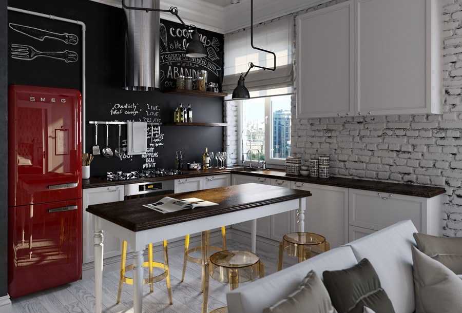 Подобное дизайнерское решение имеет положительные и отрицательные стороны. Чтобы меловая доска оказалась уместной, нужно познакомиться с ними подробнее. Среди плюсов использования выделяют следующее: