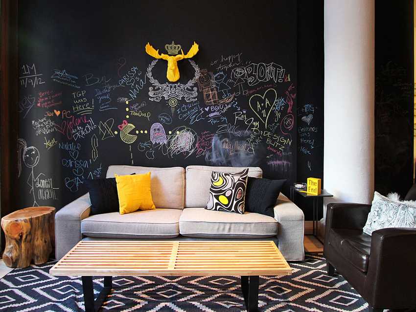 С помощью специальной грифельной краски в комнате создается зона, внешне действительно напоминающая обычную школьную доску, на которой можно многократно мелом наносить любые изображения. Например, целая стена в детской станет отличным полигоном для малыша, где он сможет развивать свои художественные навыки. Причем, он также самостоятельно будет удалять их и воплощать новые идеи.