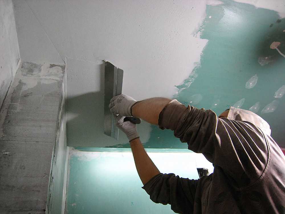 - Затем выполняется шпатлевание стыков, а также головок саморезов, которые слегка утоплены в поверхность гипсокартона. Для этих целей можно воспользоваться узким шпателем.