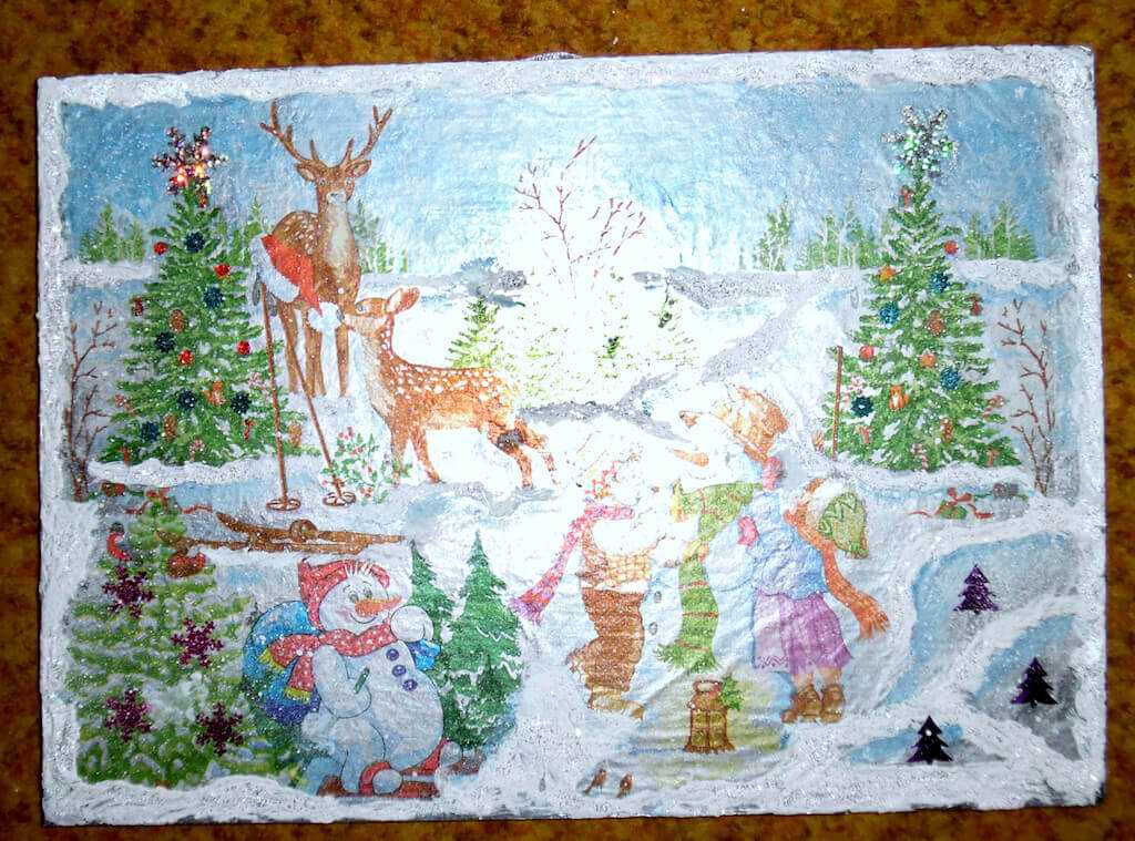 - Далее поверхность панно посыпаем тальком, а выемки заливаем воском. Рельефные углубления подкрашиваем темной краской.