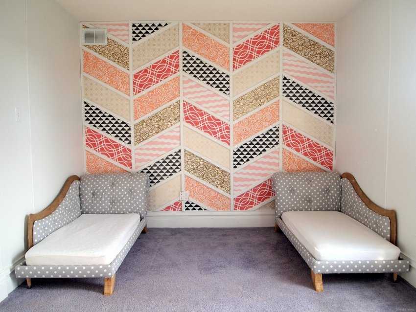 Если после ремонта у вас остался излишек нескольких видов шпалер, можно с легкостью создать необычную активную стену из отрезков материала. Для формирования оригинальной аппликации нарежьте остатки в виде геометрических фигур: