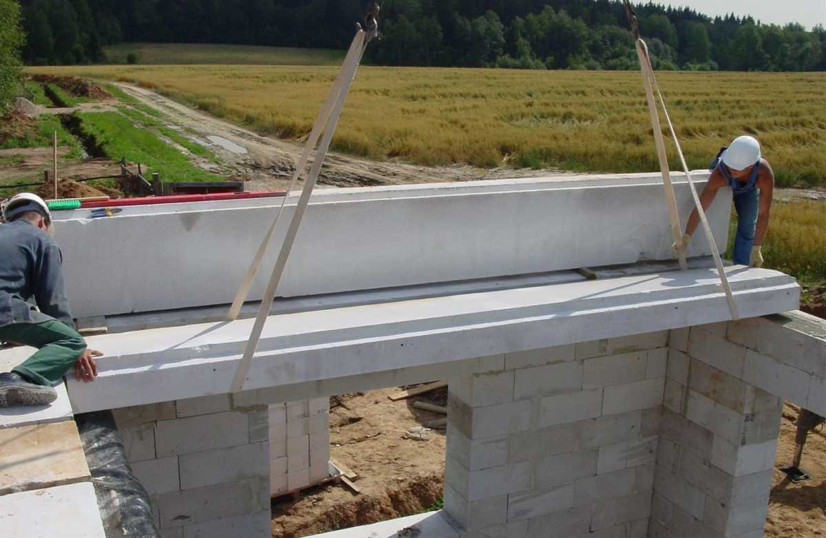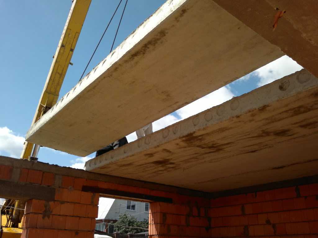 Далее, с помощью подъемного крана размещаются бетонные балки перекрытия, шероховатая часть является верхней, гладкая — нижней. Все дальнейшие этапы вполне выполнимы своими руками. Возможны проблемы, связанные с размерами блоков, не всегда удается перекрыть все пространство. В этом случае плиты раскладываются с отступом в половину оставшегося свободного места, а полученные промежутки заполняются обрезками железобетона или шлакоблоком и заливаются тем же цементно-песчаным раствором, что и для армопояса. Для упрощения сцепления при закладке позволительны незначительные щели, но не более 5 мм, однако желательно их избегать. Согласно прилагаемой инструкции, не допускается монтаж сильно поврежденных плит при возведении многоэтажных зданий, но на надежность конструкции в малоэтажном доме мелкие дефекты и трещины не повлияют.