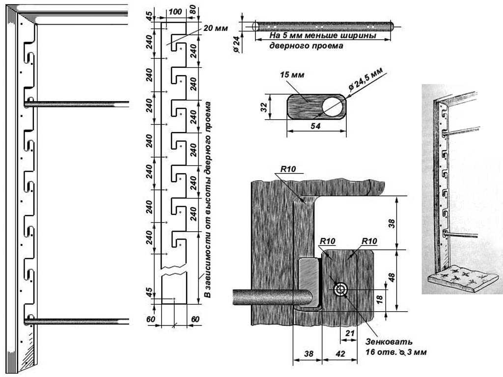 - если пластины выполнены из дерева, их врезают в дверной добор или крепят к стенам анкерами на нужной высоте;