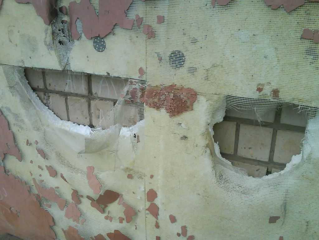 Не беритесь за утепление, обнаружив эти недостатки. Сначала уберите эти кусочки штукатурки, а затем поработайте зубилом, сбив бетонные наплывы и лишний раствор между кирпичами.