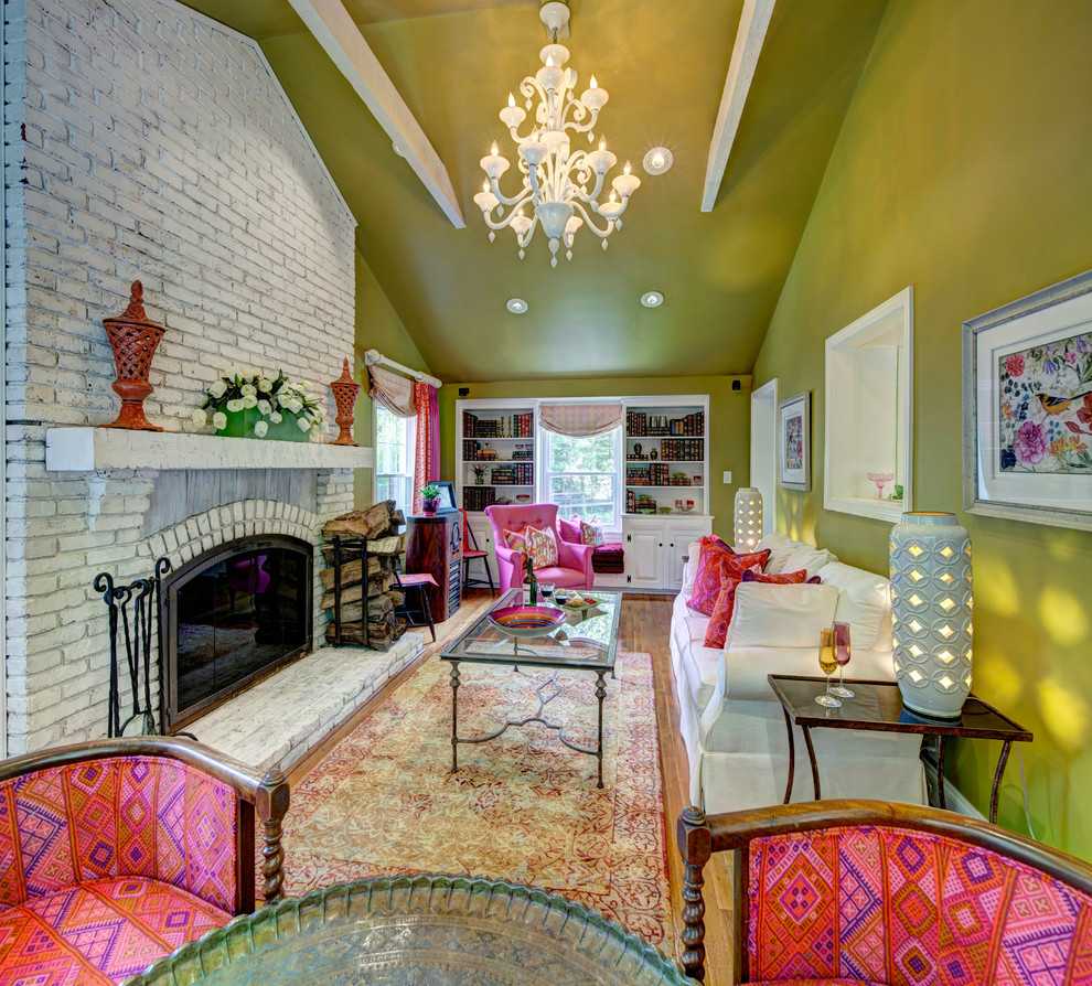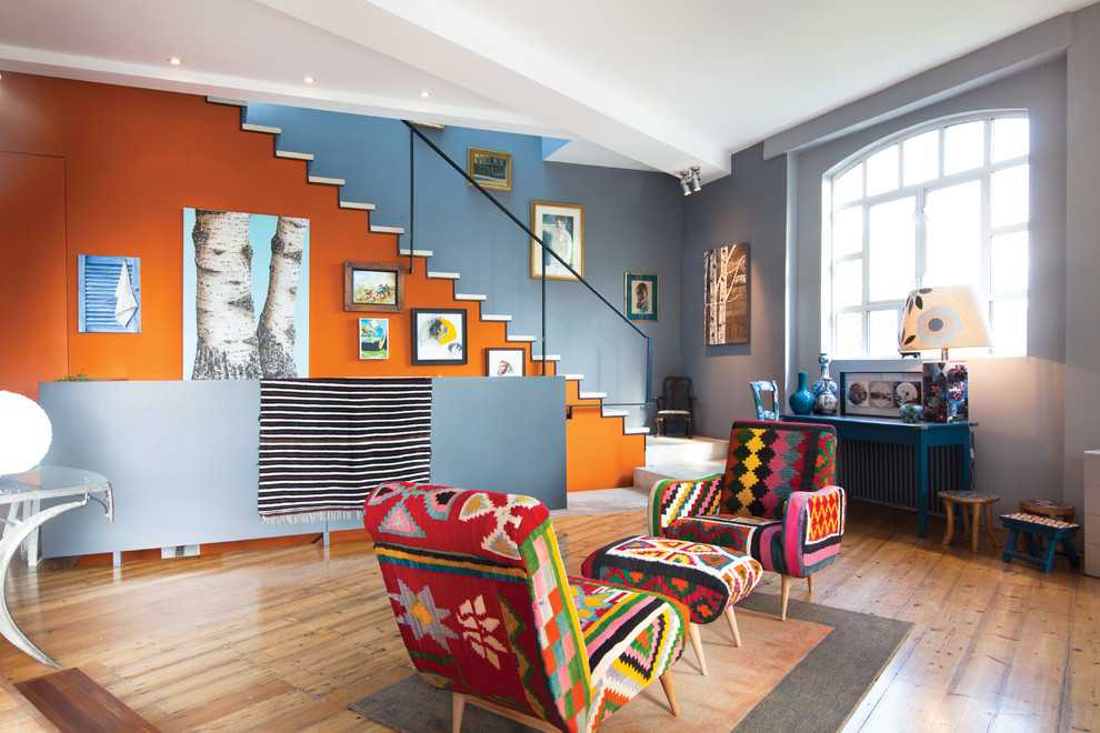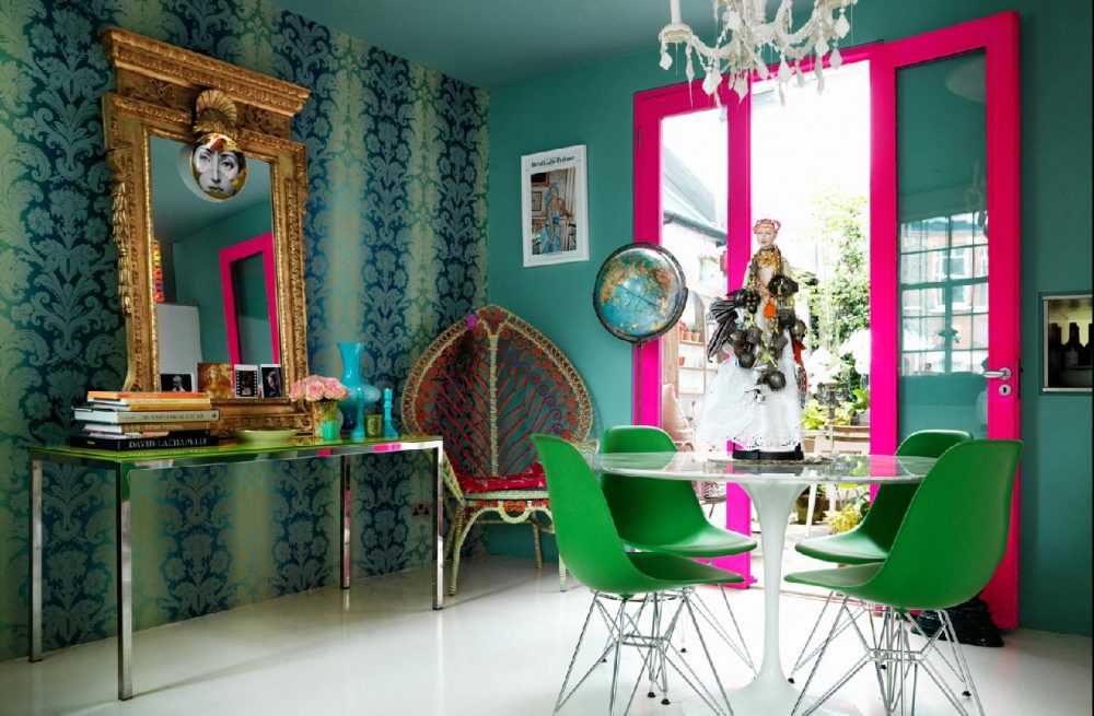 На фоне пестрой и насыщенной краски необходимо располагать мебель и декор спокойных тонов, чтобы уравновесить интерьер.