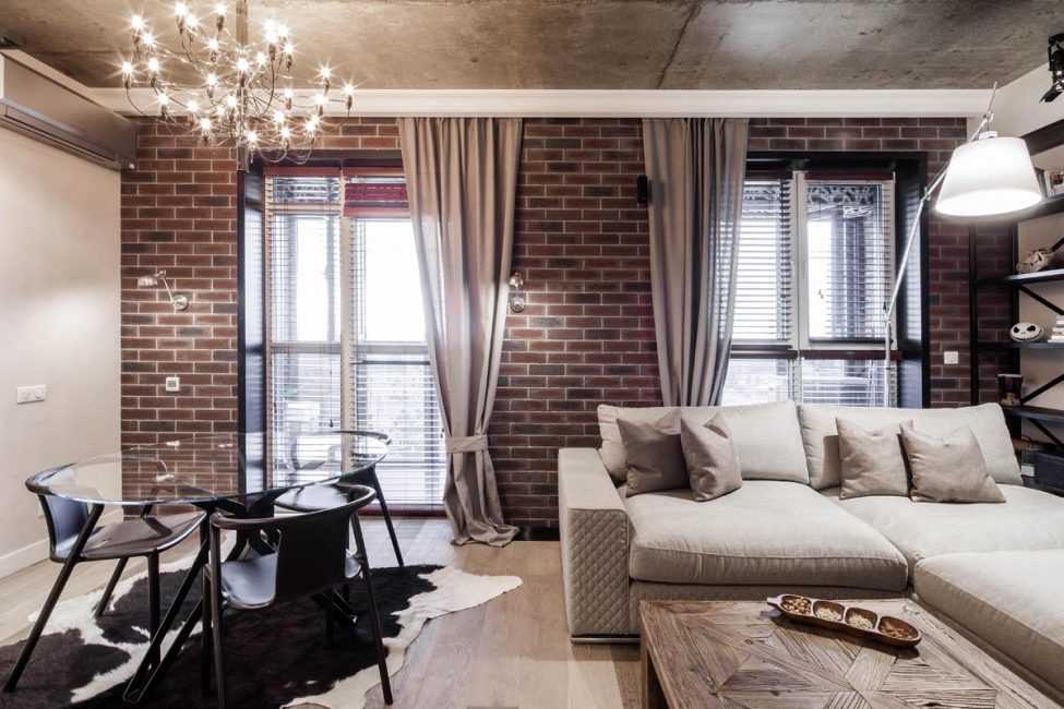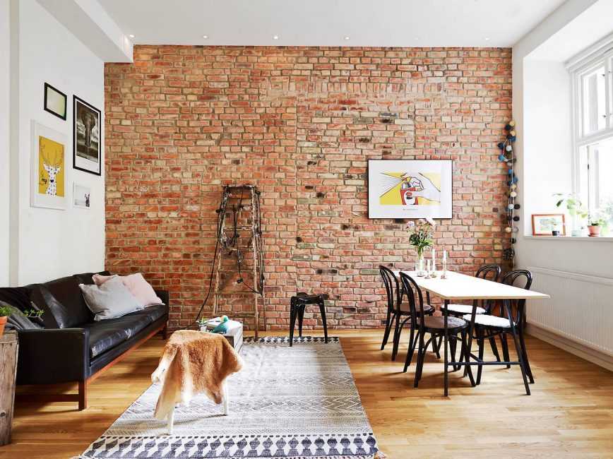 Кирпичная стена в интерьере гостиной