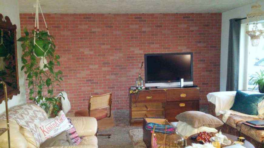 Для семейной пары – одна половина стены из кирпича гладкая, зашпаклёванная, пастельного цвета. Другая часть остаётся в натуральном виде. Завершающая деталь – диван или ТВ-экран.