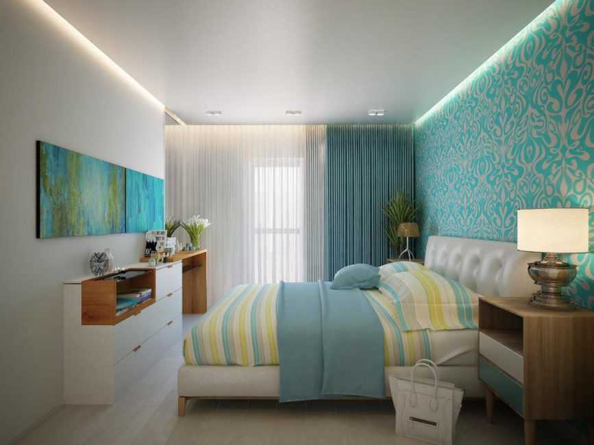 Оригинальные пространственные иллюзии открывают двери в другой мир или меняют конфигурацию спальни. Подобным свойством обладают и контрастные полосатые обои типа «зебра», когда на узкой торцевой стене они идут горизонтально, а на большой стене – вертикально.