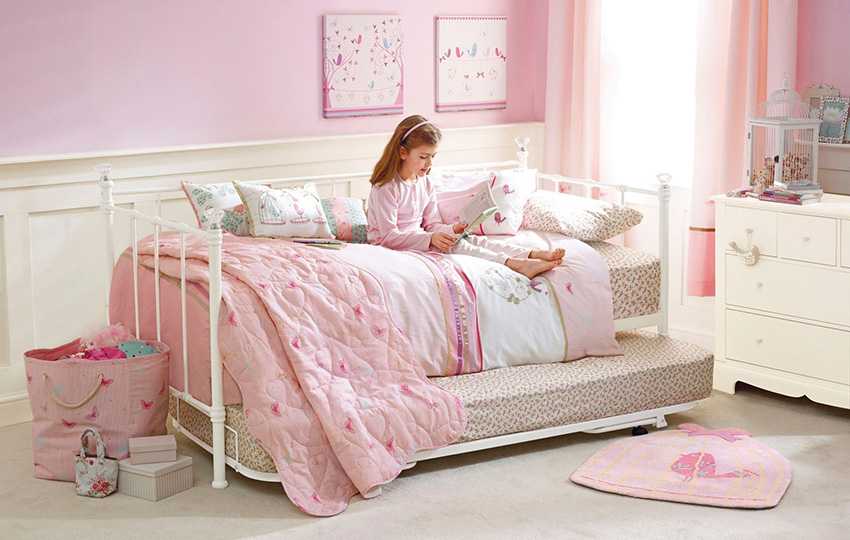Главное место в комнате девочки занимает кровать, поскольку, в отличие от мальчиков, которые чаще играют на полу, девочки любят играть именно на кровати. Здесь они болтают по телефону, секретничают с подружками, читают книжки, расчесывают куклам волосы или просто мечтают. Поэтому чем больше кровать, тем лучше.