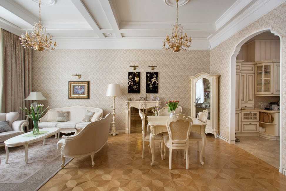 При оформлении интерьера гостиных с полом светлого цвета такие ограничения отсутствуют. Обои можно выбрать любые: светлые, темные, однотонные или с рисунком. Но лучше клеить только на одну сторону, если они темные.