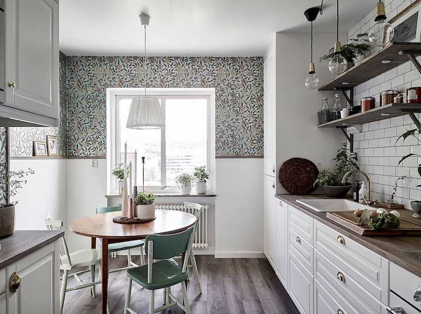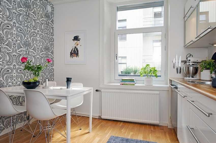 Если кухонный гарнитур белого цвета, необходимо отказаться от светлых обоев