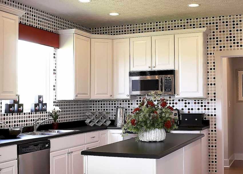 Черно-белый кухонный гарнитур выигрышно выглядит на светлом фоне. Здесь можно использовать как однотонные покрытия, так и изделия с неярким орнаментом. Последний вариант обоев для кухни должен применяться лишь при оформлении определенных зон.