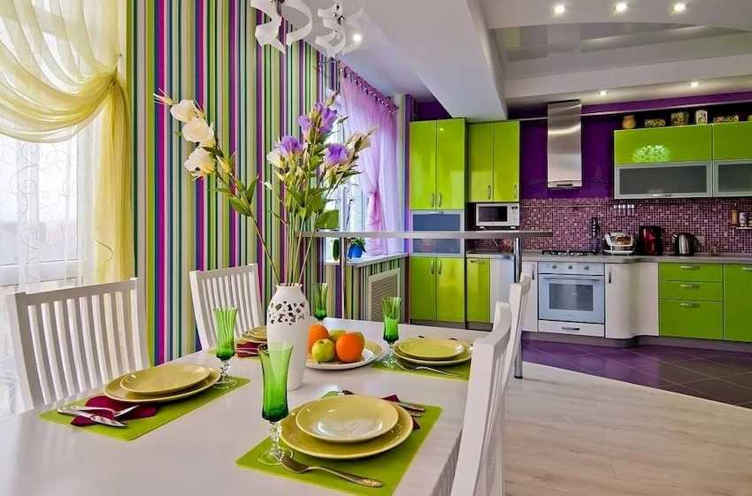 Зеленый гарнитур делает интерьер жизнерадостным, оптимистичным, поднимает настроение и заряжает положительными эмоциями. Он лучшим образом выделяется на белом, стальном, синеватом или другом фоне холодной цветовой гаммы. Оттенок подбирается в зависимости от насыщенности мебели. Для яркого гарнитура используются приглушенные цветовые варианты обоев на кухню. Спокойный оттенок фасада подчеркнут сочные детали на покрытии. Гармонично выглядят фисташковые и приглушенные травяные тона мебели на голубом, розовом, кремовом или молочном фоне.