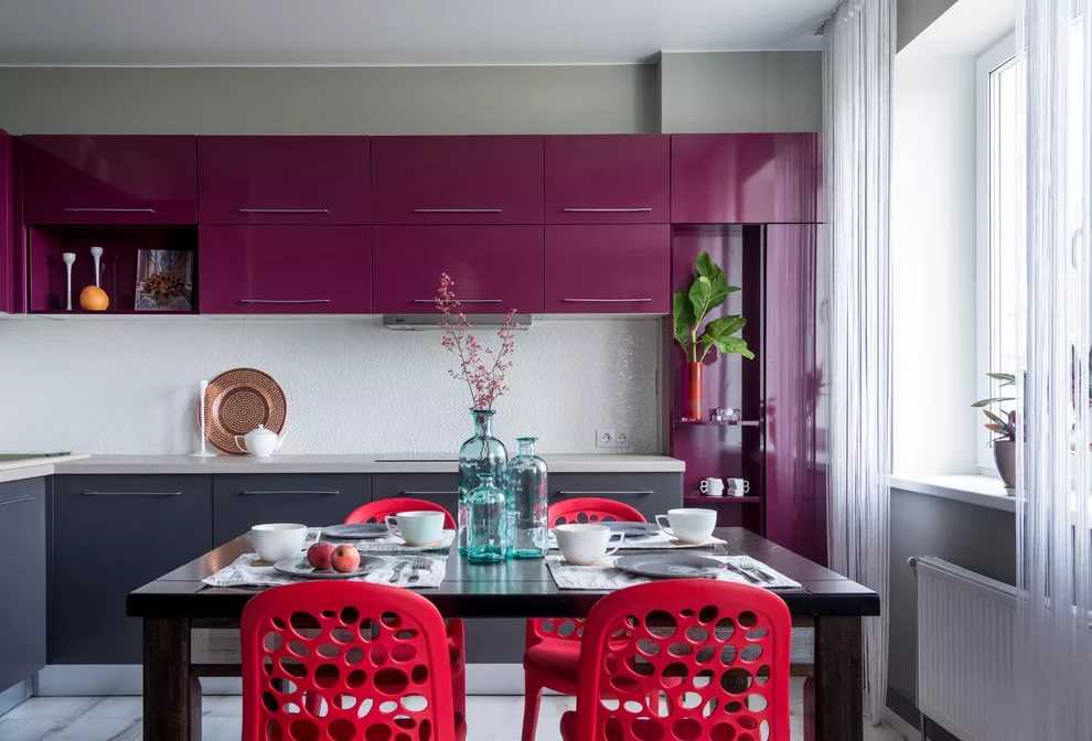 Красный гарнитур также не нуждается в ярких акцентах. Он гармонично смотрится на белом, сером, молочном и мраморном фонах, что уравновешивает интерьер, выгодно и эффектно представляя мебель.