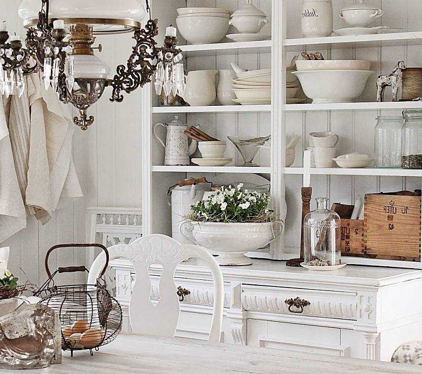 Заполните кухню-гостиную светлыми, пастельными тонами, слегка постаревшей мебелью, аксессуарами из натуральных материалов, цветами и безделушками из камня или фарфора.