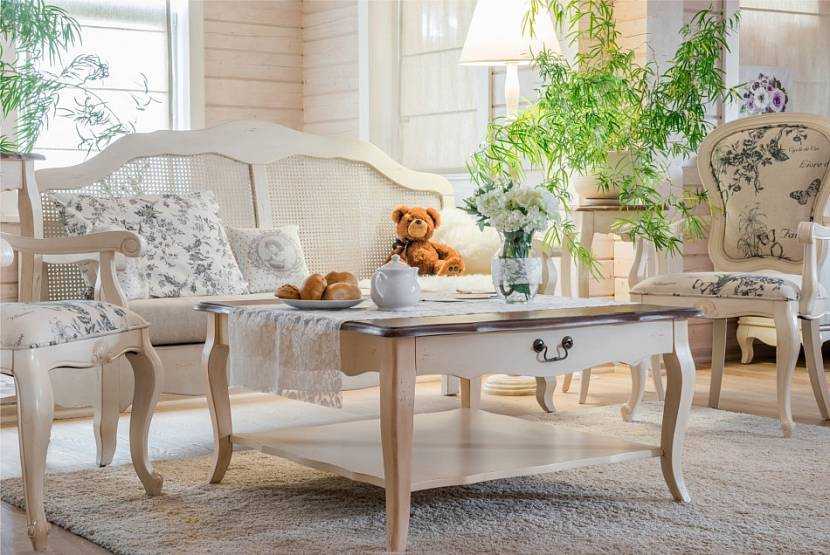 Белый цвет и его вариации – всегда лучший выбор для небольших гостиных, в которых не хватает дневного света. Для стиля прованс белый цвет и вовсе родной. На фоне светлых стен, пола и потолка особенно выразительно смотрится мебель. Еще лучше и отчетливее проступает фактура дерева, а даже самые нежные и бледные оттенки становятся ярче и выразительнее.