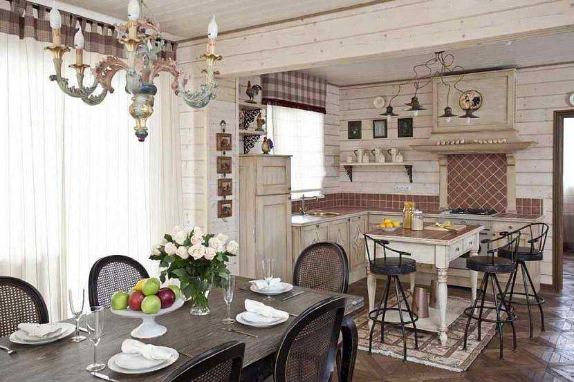 В кухне нужно хорошее освещение из различных источников и, желательно, большое окно. Светлые пастельные стены, старая, потрескавшаяся и слегка запятнанная мебель, обильное использование кованых металлических элементов, аксессуары из меди и бронзы, цветы в глиняных или фарфоровых горшках, открытые полки с тарелками, плетеные элементы, натуральный текстиль – все эти объединит ваш дизайн кухни и гостиной.