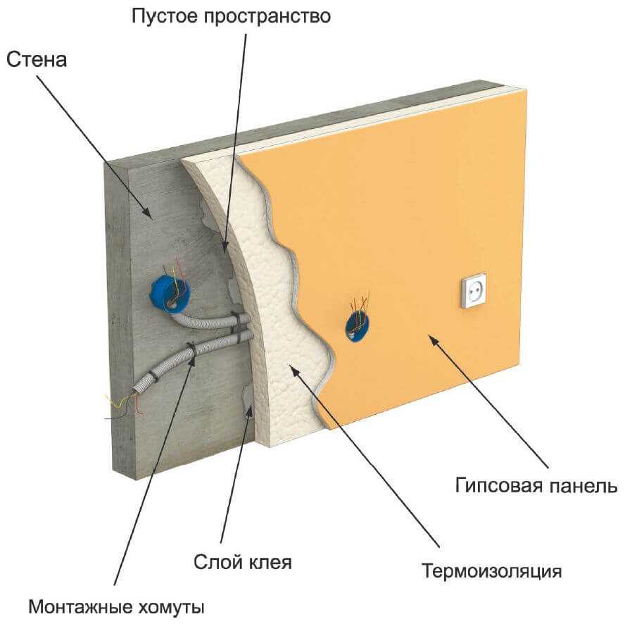 - Наличие зазора между гипсокартоном и стеной. Там прокладывают электропроводку, трубы или дополнительный слой теплоизоляции.