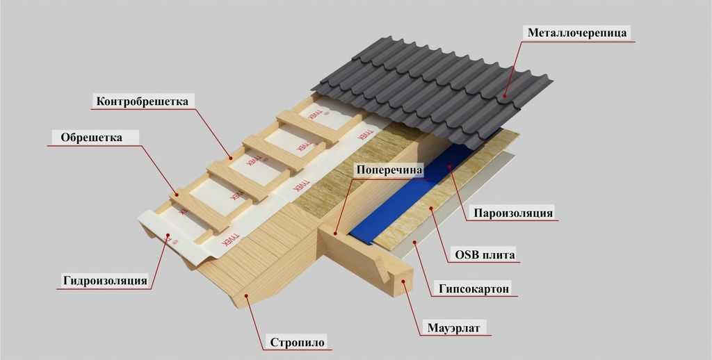 По стропилам обустраивается гидроизоляция, на которую монтируют обрешетку. Впоследствии на нее крепится материал кровли. Пространство между стропилами используется для монтажа утеплителя в виде плит.