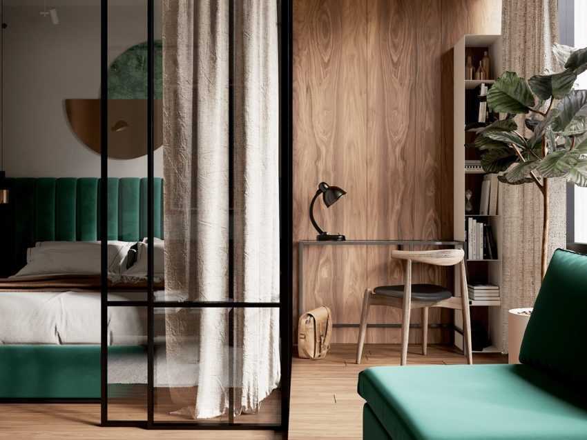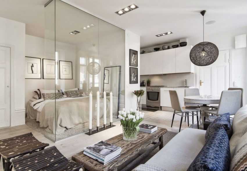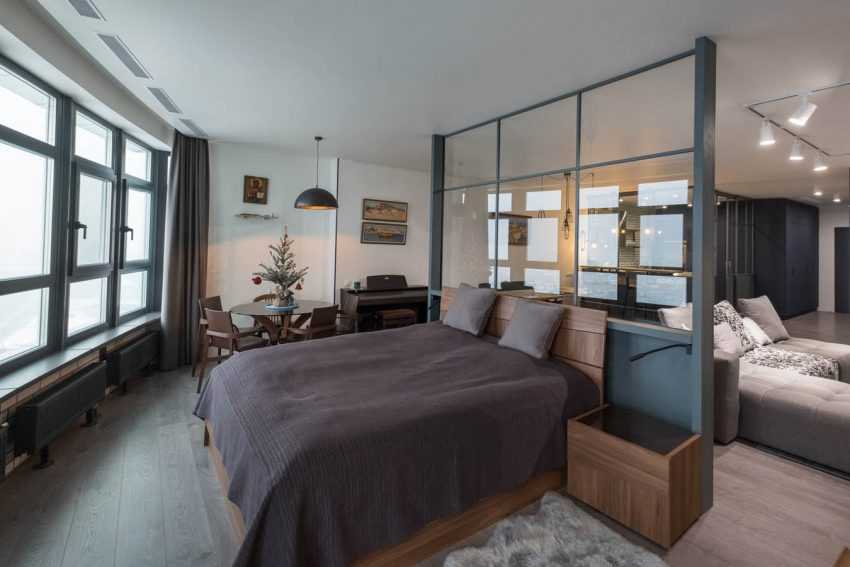 - Несколько прозрачных стеклянных конструкций являются единственным средством удачного зонирования комнаты с одним окном на теневой стороне.