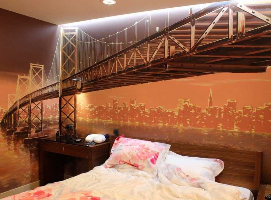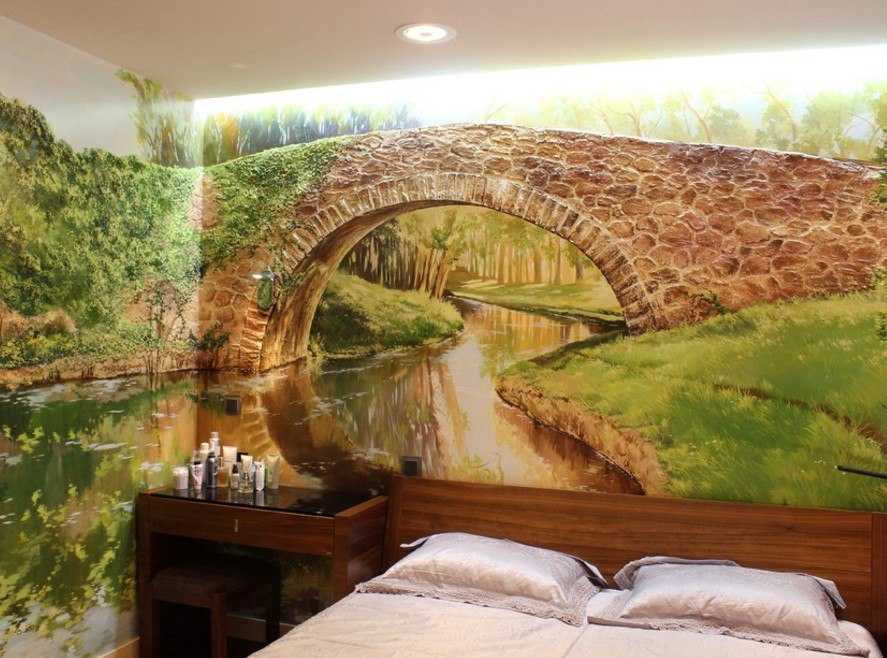 - 3D-рисунок. Своего рода иллюзия продолжения комнаты. В этих целях часто изображают пейзаж, окно с красивым видом, террасу, мостик через реку — оригинальный пример смотрите на фотографии ниже.
